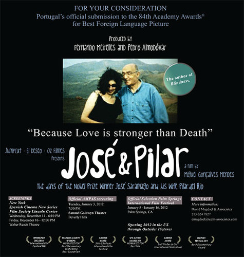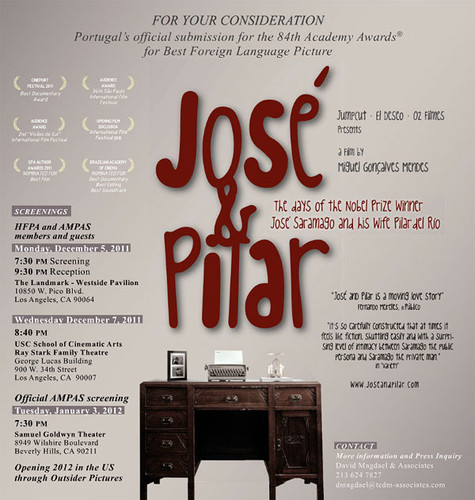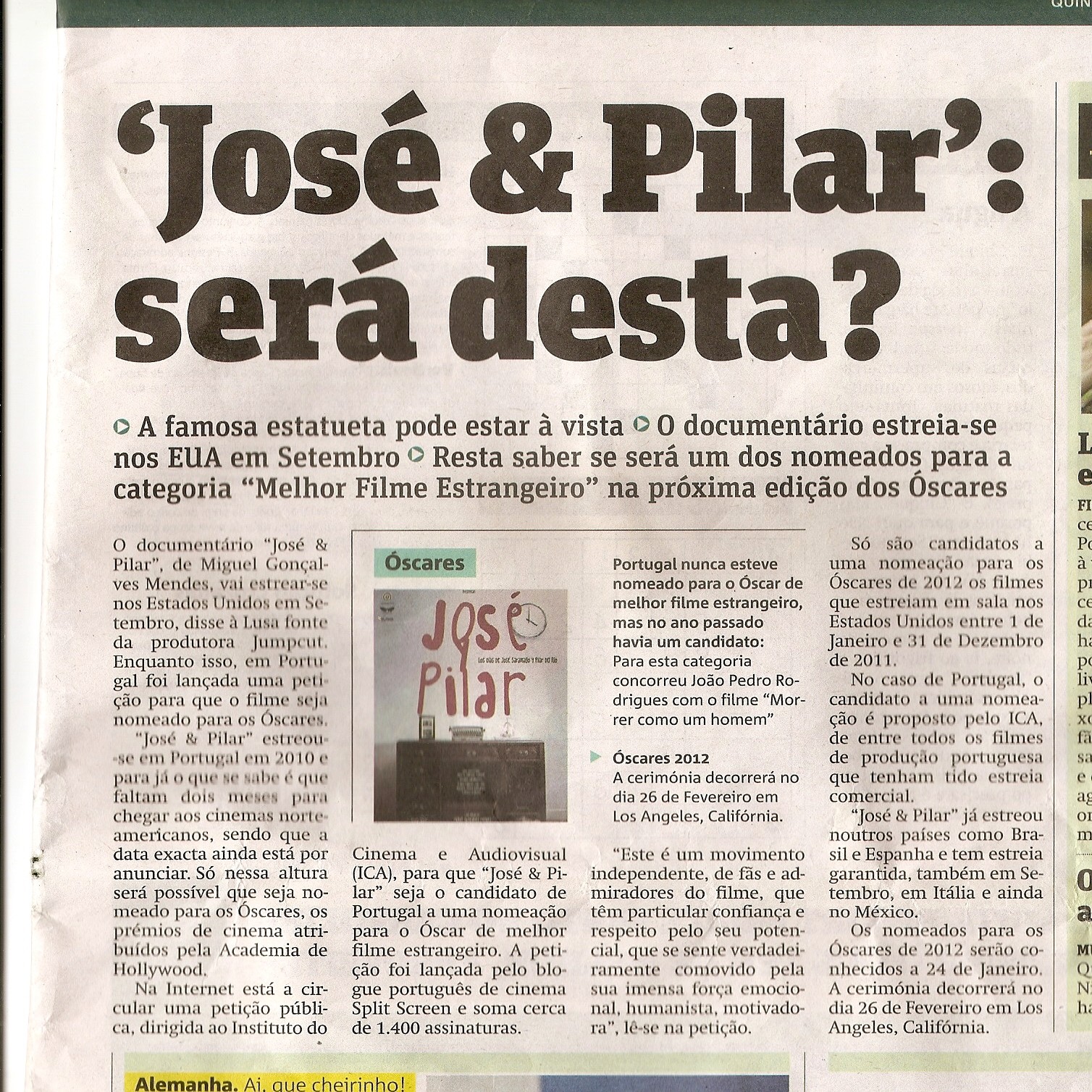 Escrevo aqui a propósito da notícia da Academia norte-americana de Artes e Ciências Cinematográficas que dá conta da lista de 9 pré-nomeados ao Óscar de Melhor Filme Estrangeiro. Ao contrário do que poderíamos desejar, José e Pilar não conseguiu chegar a esta recta final, ser pré-seleccionado e recebermos pela primeira vez uma nomeação ao Óscar. Não é por isto que a iniciativa “José e Pilar aos Óscares” deva ser considerada como inútil. Pelo contrário. O nosso objectivo não era o de directamente chegarmos às nomeações (embora implícito), mas sim o de, numa primeira instância, conseguirmos que a Comissão de Seleccção do Filme Português Candidato ao Prémio Anual para Melhor Filme em Língua Estrangeira (instaurado pelo ICA) seleccionasse “José e Pilar” como o candidato de Portugal. Esta selecção foi algo inédita, visto ser a primeira vez (a par do candidato alemão “Pina”) que um país seleccionou um documentário como seu representante junto da Academia. Foi também a primeira vez que o período que antecipou a selecção do candidato português se pontuou com tanto mediatismo nos media tradicionais assim como na blogosfera, gerando-se uma série de comentários opinativos (uns oportunos, outros nem tanto) acerca da eventual escolha de José e Pilar ou de outro filme.