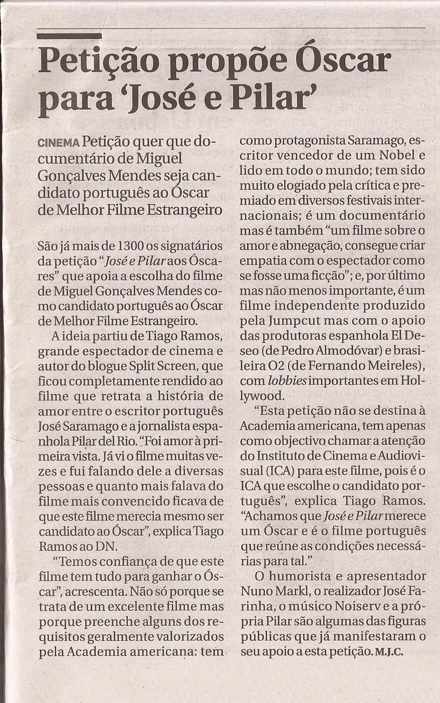 A petição José e Pilar foi alvo de um pequeno artigo no jornal Diário de Notícias de hoje (13 de Julho).